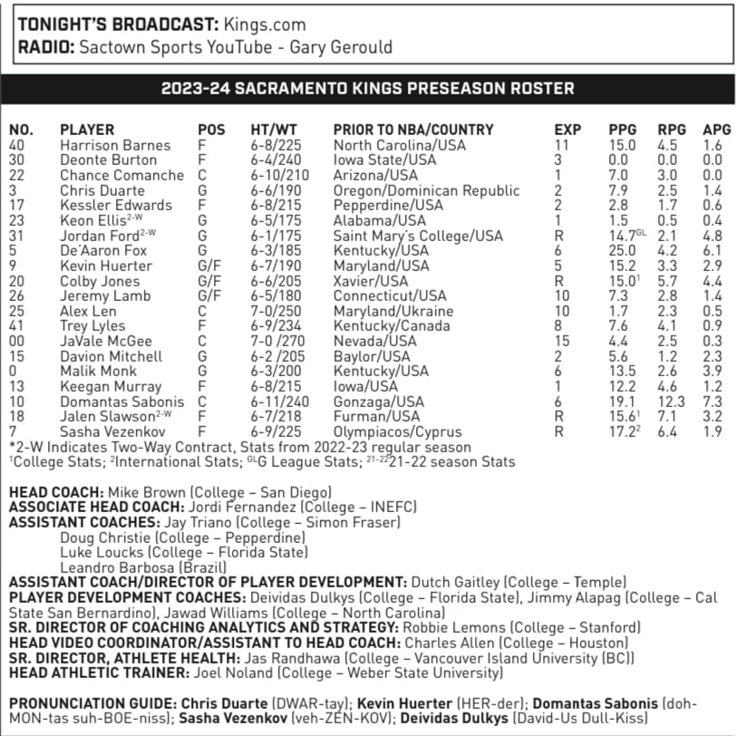 The Sacramento Kings open their 2023-24 preseason schedule Sunday evening against the Toronto Raptors north of the border in Vancouver, BC. It’s the first of five preseason games for the Kings.
