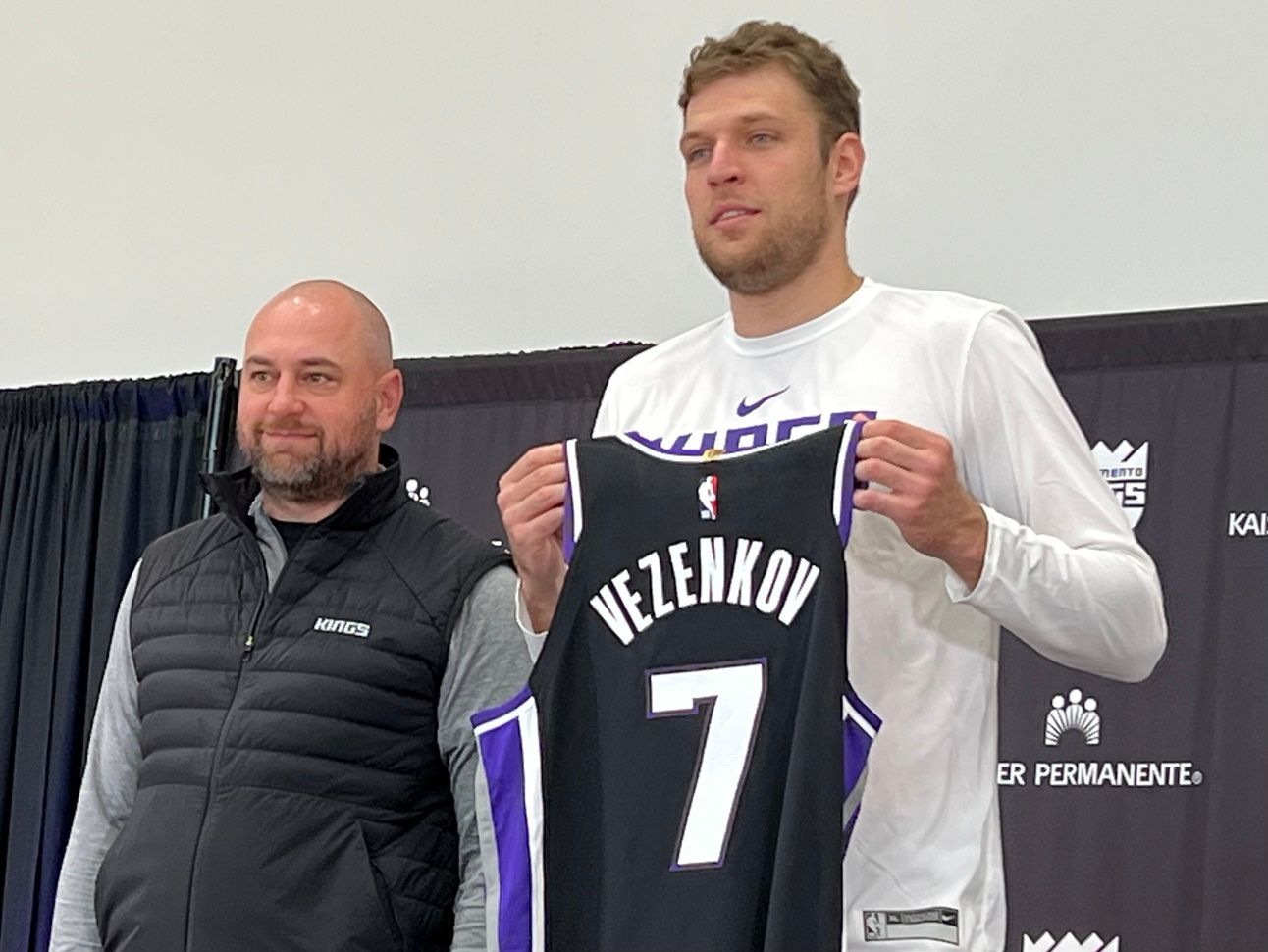 Despite the warm Sacramento day, McNair joined the media session wearing his patented puffy vest over a long sleeve shirt. Vezenkov took his seat behind the microphone wearing Kings practice gear after posing for pictures with his new No. 7 jersey.